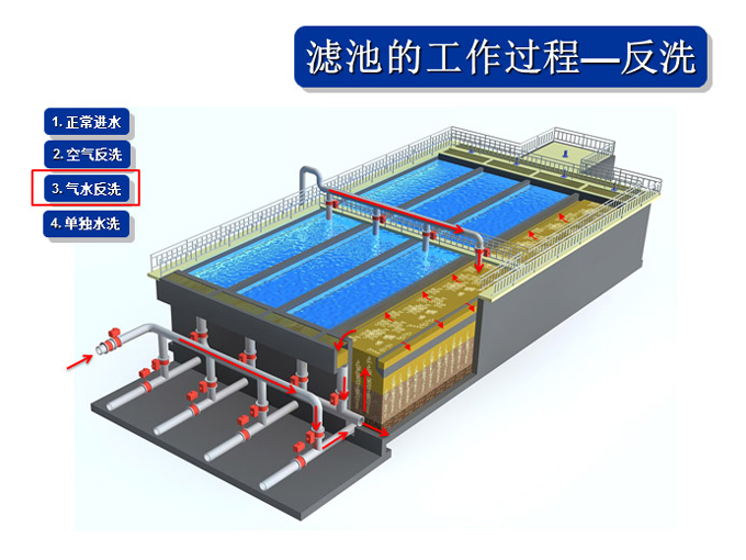 1、氣水聯(lián)合反沖冼裝置、布氣裝置、操作工藝等系統(tǒng)集成技術(shù)解決直接過濾、生物濾池生物膜脫落堵塞濾池的問題。