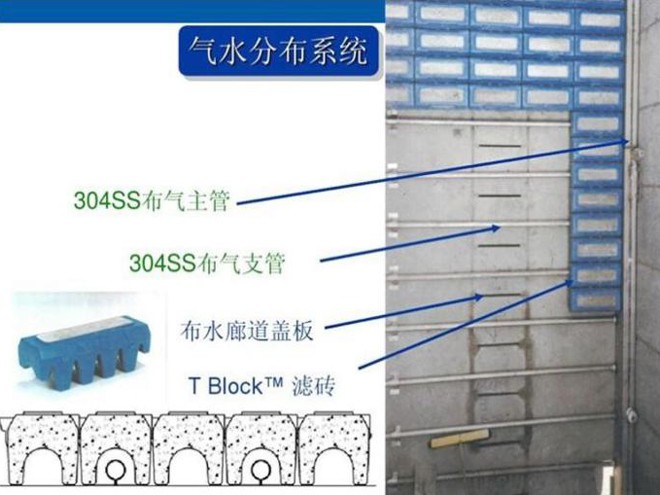 濾磚:采用混凝土澆筑而成外部HDPE(高密度聚乙烯)外殼,“T”型氣水分布濾磚,提供反沖洗氣水分配性能。