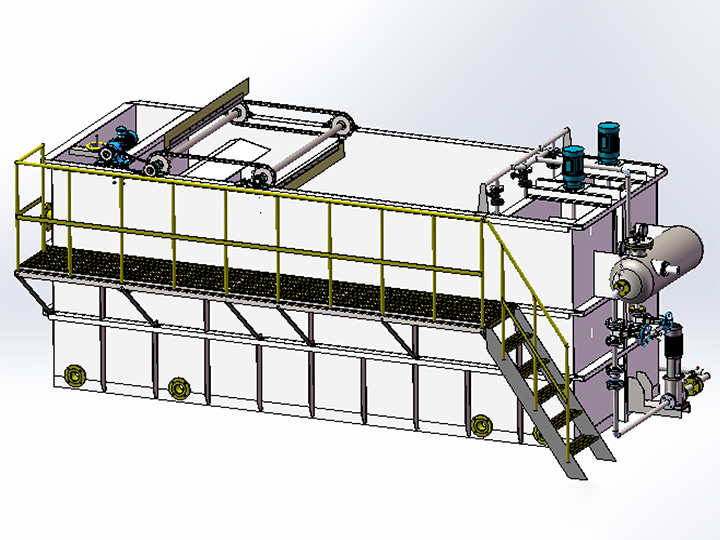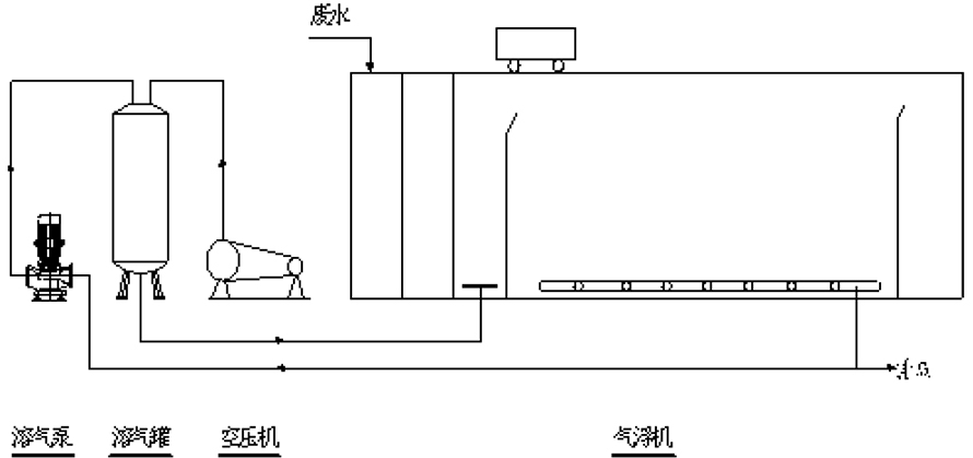 該裝置主要起固液分離作用,去除廢水中的懸浮物(SS)、油污、色度,同時(shí)可以降低COD、BOD等污染物,主要利用溶氣系統(tǒng)產(chǎn)生的溶氣水中的微氣泡,與水中的懸浮物絮體碰撞粘合在一起,形成“微小氣泡—懸浮物復(fù)合體”,該“微氣泡—懸浮物復(fù)合體”逐漸共聚,體積變大,形成比重小于1的“氣泡—懸浮物復(fù)合體”。溶氣水在 0.3-0.5MPa的工作壓力的情況下,使空氣Max限度地溶入水中,通過減壓釋放,形成直徑在20μm-30μm左右的微小氣泡。